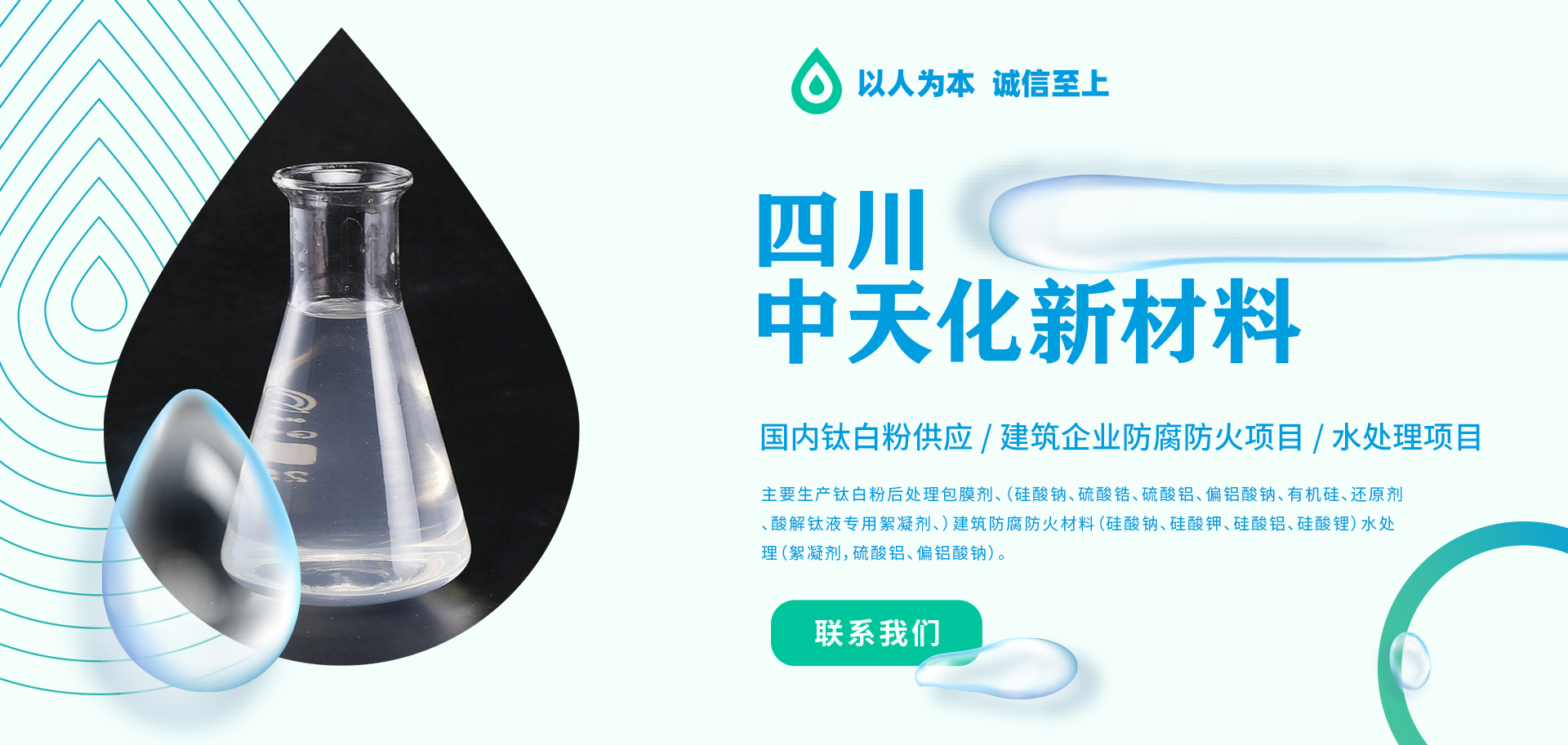 經營范圍:主要生產鈦白粉后處理包膜劑、(硅酸鈉、硫酸鋯、硫酸鋁、偏鋁酸鈉、有機硅、還原劑、酸解鈦液專用絮凝劑、)建筑防腐防火材料(硅酸鈉、硅酸鉀、硅酸鋁、硅酸鋰)水處理(絮凝劑,硫酸鋁、偏鋁酸鈉)